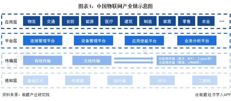 电信运营商的位置处在物联网三个层次的传输层中。从物联网产业链的角度来说,将整条产业链从上到下依次划分为上游的 RFID、传感器、芯片厂商、应用设备提供商,中游的电信运营商、中间件及应用开发商,再到下游的系统集成商和直接面向客户的服务提供商。电信运营商在这里则起了上承下接的作用,从最初的设备到最后的应用端,电信运营商始终牵头两边,搭桥上下游资源和应用。