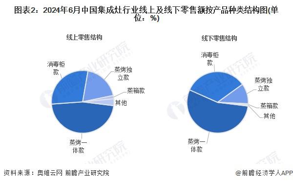 具体到细分产品类型来看,综合线上及线下零售情况,近年来,我国蒸烤一体款集成灶发展迅速,据奥维云网统计数据显示,2024 年 6 月,蒸烤一体款零售额在线上及线下零售市场的占比分别在 47% 和 55%,已反超消毒柜款产品成为集成灶第一细分品类。