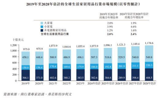 根据弗若斯特沙利文的资料,以零售额计算,2023 年全球生活家居用品行业的市场规模超过 1.05 万亿美元。