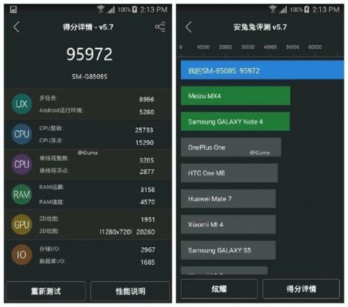 最近,跑分软件安兔兔上曝光了一张跑分在95972的照片,从图片看,型号显示为SM-G8508S,远超过目前三星发布的所有机型,包括自家的Note 5(跑分6万9)和S6 Edge+(跑分6万8)。所以小编大胆猜测,这非常有可能将是Galaxy S7。