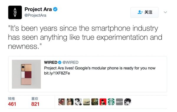 在去年 9 月, Google 正式砍掉了 Project Ara 项目,其官微上最后一条 Twitter 是转发《连线》杂志的一篇文章,题为《Project Ara 上线:Google 的模块化手机已经准备好了》,令人唏嘘。