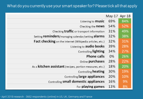 除跟踪智能音箱的出货量外,Futuresource还会对消费者行为进行研究。根据该公司在今年4月份对美国、英国、德国和法国的消费者进行的研究,结果显示,与近一年前相比,智能音箱排名前二的用途分别是听音乐(从69%增加到84%)和查看新闻(从54%下降到52%)。排名第三和第四的则分别是查询交通信息以及设置提醒和警报。