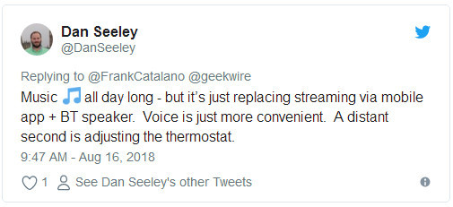 为了更清楚的了解智能音箱对用户行为的影响,来自美国科技媒体GeekWire的媒体人弗兰克·卡塔拉诺(Frank Catalano)进行了一次非正式的社交媒体问答,公开询问用户使用智能音箱的场景以及它是否对其生活的各个方面产生了影响。在这些答案中,听音乐,看新闻和天气等跻身榜首,而被反复提及的包括警报、记录待办事项清单以及控制房屋的灯。