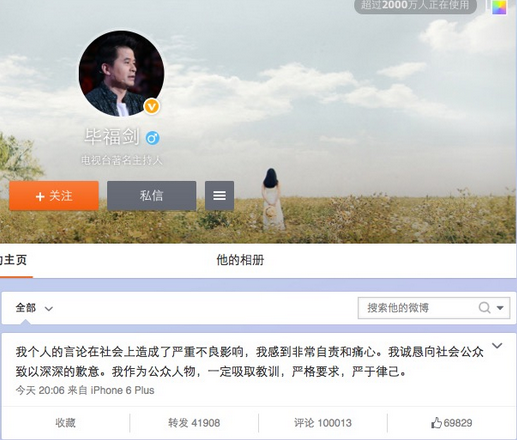 今天晚上八点,毕福剑在其微博上发道歉声明:我个人的言论在社会上造成了严重不良影响,我感到非常自责和痛心。我诚恳向社会公众致以深深的歉意。我作为公众人物,一定吸取教训,严格要求,严于律己。