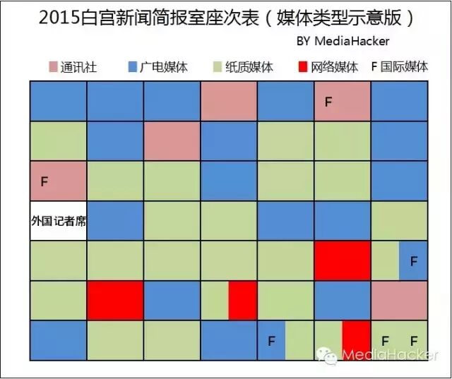最后奉上按媒体类型填色的最新白宫新闻简报室座次表一份。强势的广电媒体,中坚的纸质媒体,爬升的网络媒体,不同媒体势力分布一目了然: