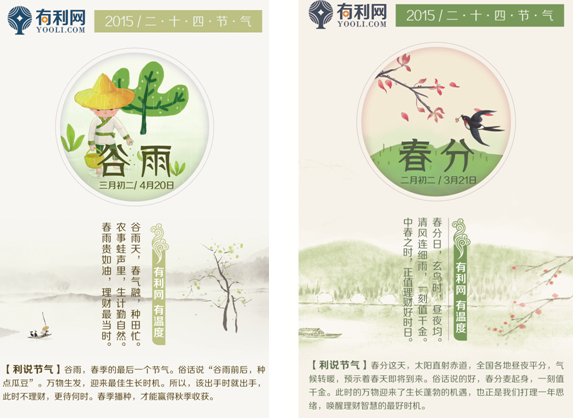 有利网另外一个做得比较好的“知书达理”的案例是,结合二十四气节,推出的“有利网,有温度”系列海报。以小清新的风格,知识性地告诉网友什么是春分、谷雨、清明,在此之间都要做些什么。这样的海报,相信大家看了也不会觉得反感,反倒会觉得有点小温暖,甚至引发对中国传统文化的兴趣。