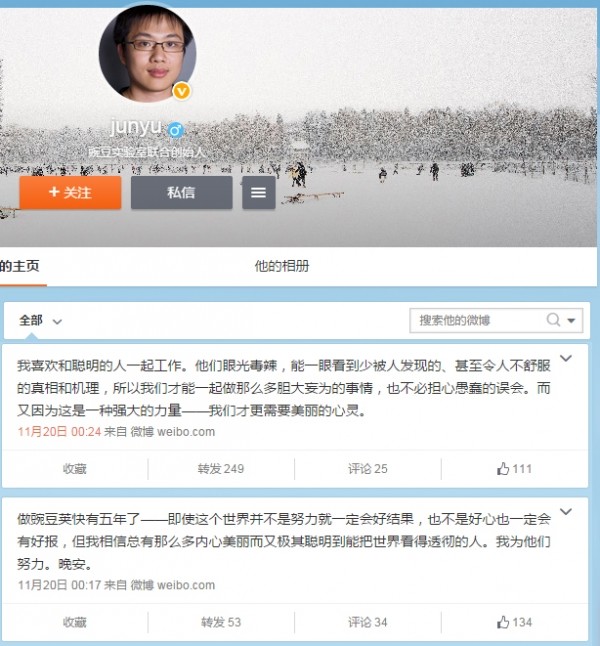 微博1、@junyu:做豌豆荚快有五年了——即使这个世界并不是努力就一定会好结果,也不是好心也一定会有好报,但我相信总有那么多内心美丽而又极其聪明到能把世界看得透彻的人,我为他们努力,晚安。