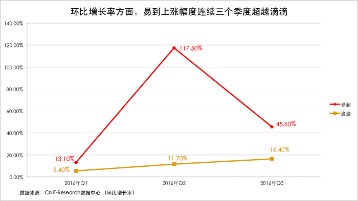不仅如此,今年前三个季度的环比增长率方面,易到的增长幅度还均超越了滴滴,其增长率均呈现至少高于滴滴的2.5倍态势。其中,易到第二季度的环比增长率是滴滴的10倍。