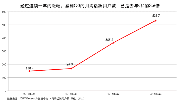在2016年的第三季度,一直注重深耕服务体验的易到,也保持着不同力度的充值返现活动(期间滴滴已停止补贴,原有服务优势的易到进一步占据价格优势),并为用户提供免费硬件、生态福利等具有惊喜感的附加服务。这使得参加充值活动的新老用户自身活跃度的大幅提升,而这些用户也无形中加大了对易到的口碑传播效应,包括Q3之前尚有余额的用户,就又进一步拉动了更多新用户的加入,并带动他们更高频化的使用。