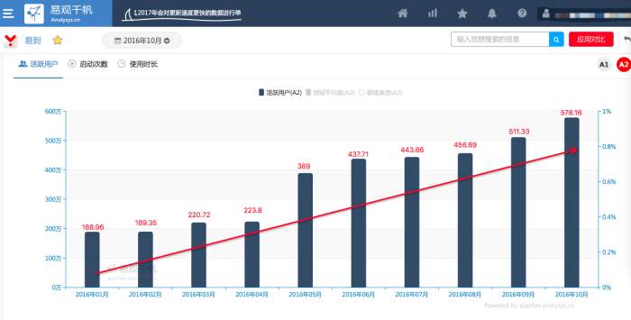 根据国内权威第三方数据机构易观10月移动出行市场的数据显示,易到月度活跃用户最新涨至578.16万人,相比9月上涨了超13%。据易观2015年12月至今数据显示,易到已保持了连续10个月的稳定增长,继续创造移动出行行业里最长的连续增长记录。