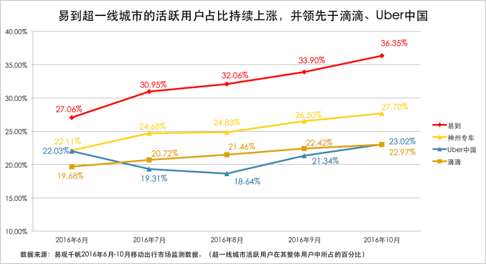 易到超一线城市活跃用户占比达36.33%, 大大领先于滴滴专栏