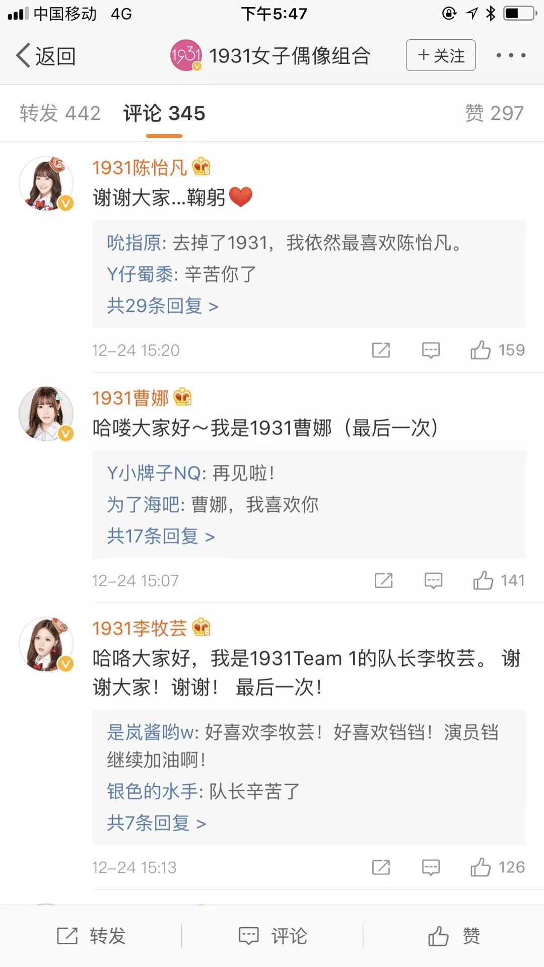 12月24日平安夜,名为“1931女子偶像组合”的官微贴出一份盖章的公告,内容寥寥数句,“欢聚传媒旗下1931女子偶像组合将于2017年12月29日正式终止运营。感谢成员三年来的努力,感谢大家三年来的支持与热爱。青春里,有你不孤独,记忆中,有你很温暖。”