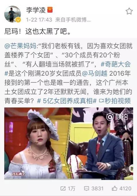 在2017年初参加《奇葩说》第四季走红的辩手马剑越录制的小视频中,外界多少能够感受到加入一个“不红的、没有通告”的团究竟处于何种生活状态。后来在《奇葩说》,她自黑惨淡的偶像生涯及“5亿女团养成真相”成为吸粉的亮点之一,诸如“30个成员20个粉丝”。随后YY创始人李学凌还亲自转发澄清过“尼玛,这也太黑了吧”。此后,“奇葩偶像”也可在马剑越通告活动的新闻稿标题中见到。