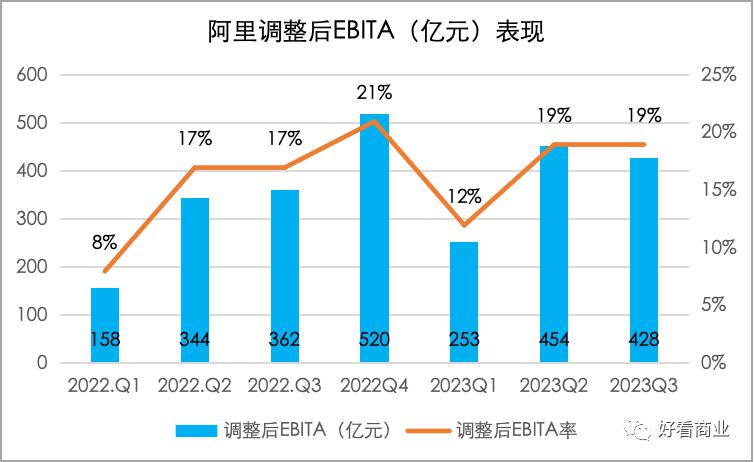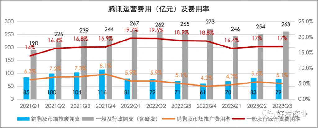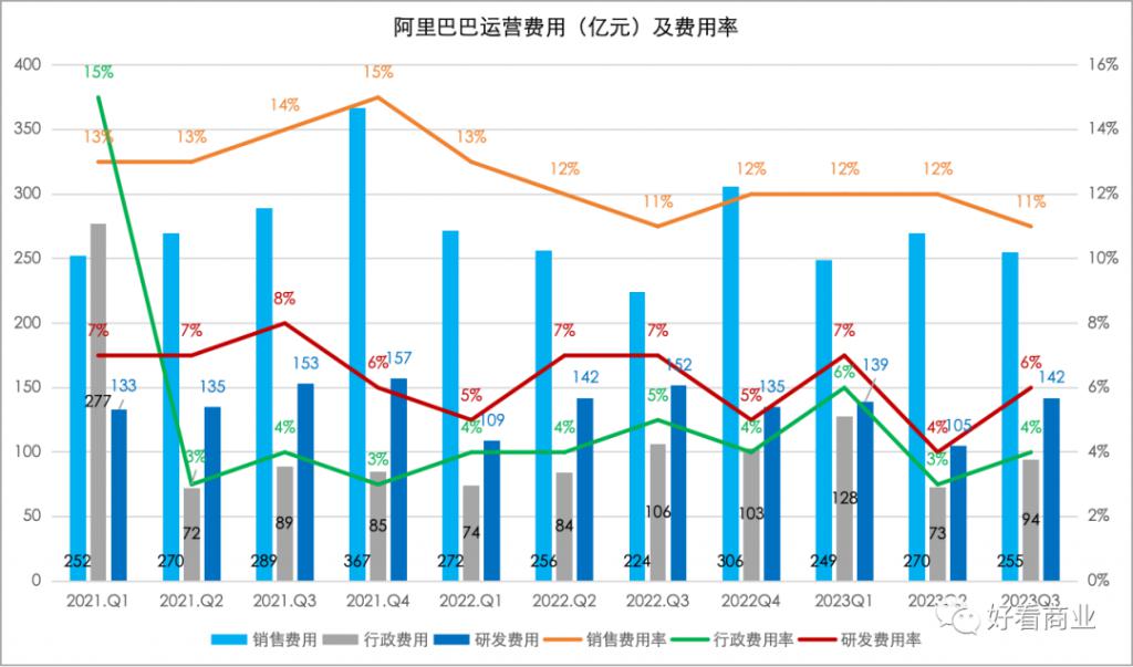 阿里、腾讯也通过 " 省省省 " 实现了更多盈利。其中,被省得最多得是销售 / 营销费用。2021 年 Q4 以来,阿里巴巴得销售费用率从 15% 的高点几乎一路下调,2023 年 Q3 的销售费用率是 11%。