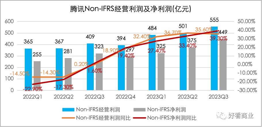 今年 Q3,腾讯实现 Non-IFRS 经营利润 555 亿元,Non-IFRS 净利润 449 亿元,分别同比大增 35.6% 和 39.3%,两项均大超市场预期。