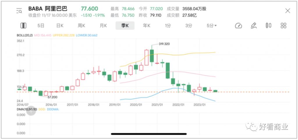 11 月 17 日美股盘前,阿里巴巴发布 2024 财年 Q2(对应自然年 2023Q3)财报,信息量很大,其中包括集团不再推进阿里云完全分拆,盒马暂停 IPO 等。再加上盘前披露马云家族信托将减持阿里 1000 万股股票,当晚阿里在美股可谓翻江倒海,开盘即跌 7.81%,最终以跌超 9% 收盘。