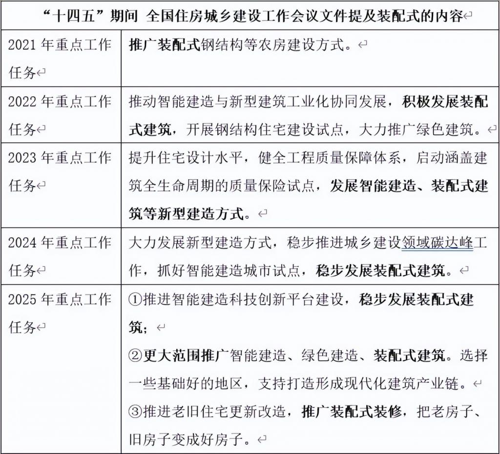 2016 年,国务院《关于进一步加强城市规划建设管理工作的若干意见》和《关于大力发展装配式建筑的指导意见》都提出:10 年时间,装配式建筑占新建建筑比例达到 30%。此后,住建部关于建筑业的诸多政策文件及发展规划中,也提及 " 要大力发展装配式建筑要求,积极推进装配式装修方式 "。