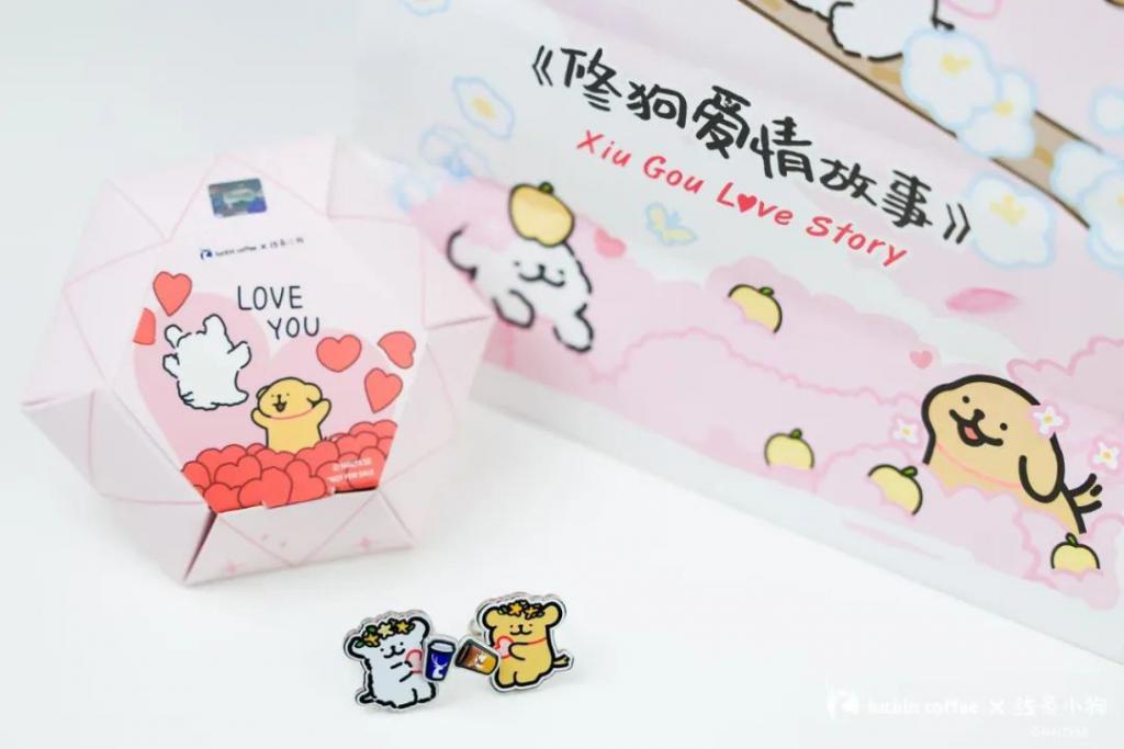 相比之下,瑞幸对情人节的态度就更淡漠一些,但对于社交传播也是得心应手。2025 年开年,瑞幸选择与《修狗爱情故事》合作。这是瑞幸与线条小狗的四搭了,这次合作的饮品是小白梨拿铁和小黄杏美式。不过情人节期间,联名纸袋、杯套及周边均用粉白作为主色调。这次瑞幸还推出了可以转圈圈的小狗对戒,成功俘获了很多年轻消费者的少女心。