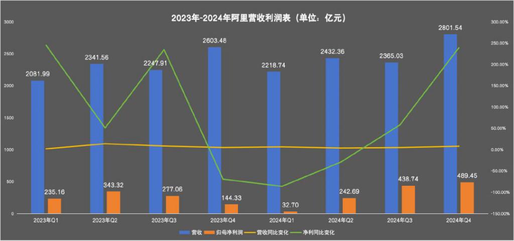 财报显示,2024 年 Q4 阿里表现稳健,营收同比增长 8% 至 2801.54 亿元,归母净利润同比上升 239.12% 至 489.45 亿元。而 2024 年全年,阿里营收 9817.67 亿元,归母净利润 2203 亿元。