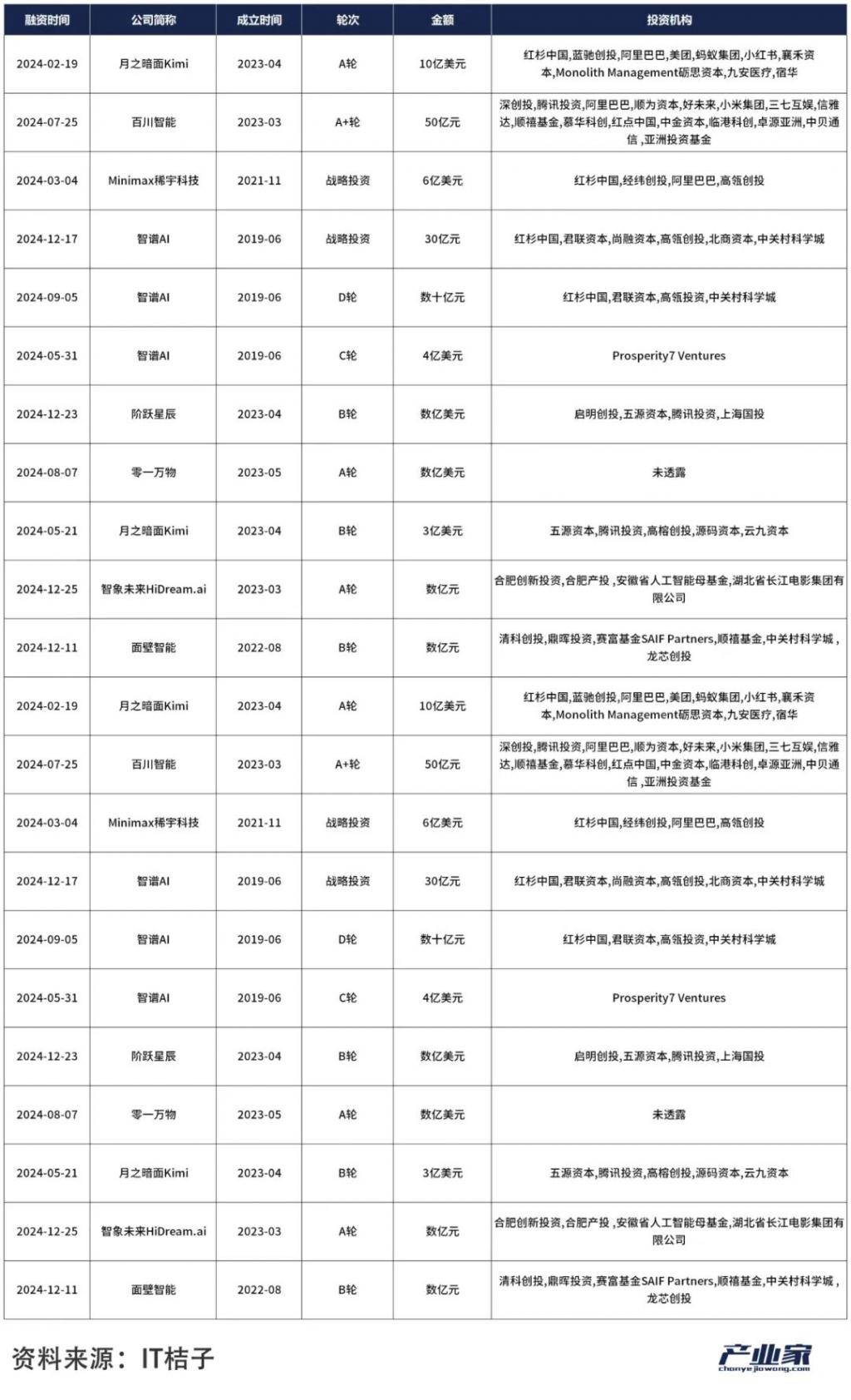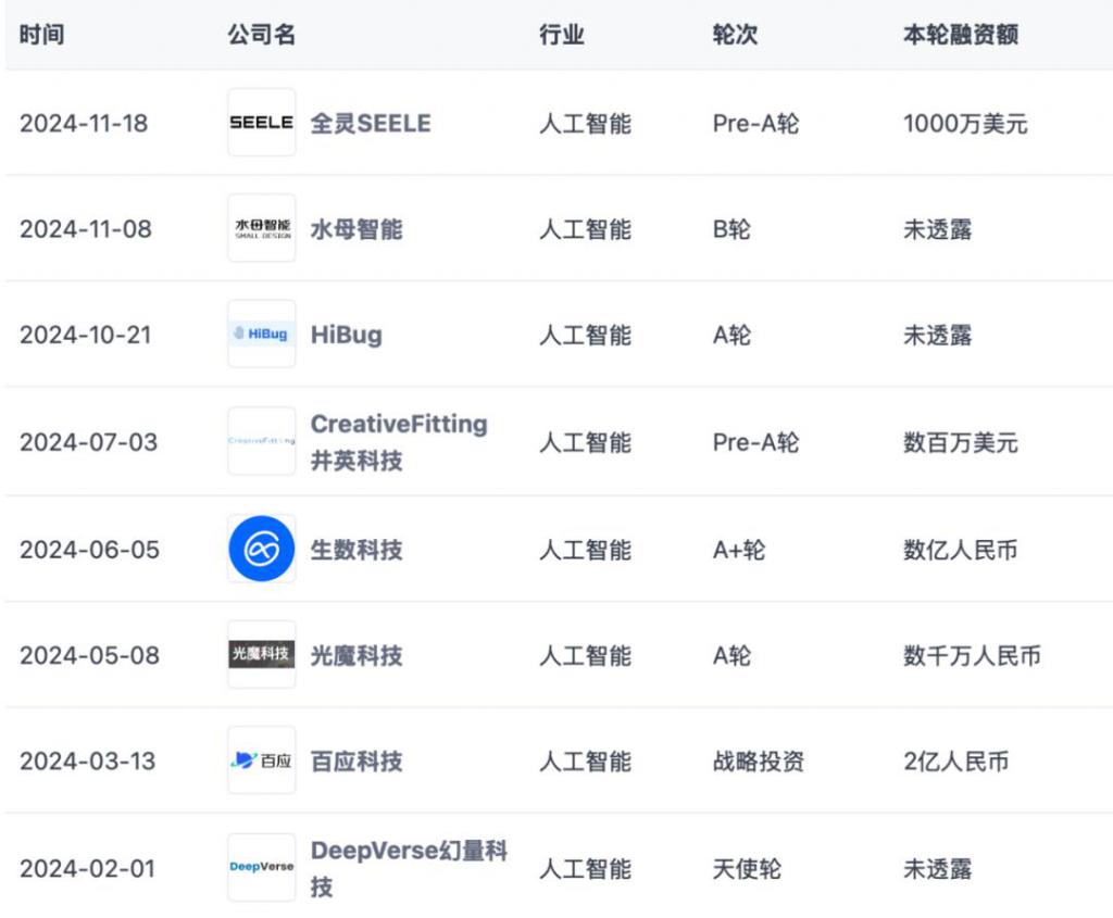 产业家统计,2024 年,AI 领域融资金额高达 6619 亿元人民币,同比增长 101.9%;然而投资事件数与上一年并无相差太多。AI 项目中出手最频繁的知名投资机构 " 红杉中国 ",在过去一年投资金额整整翻了一番,而投资数量却同比减少 55.6%。可以看到,在不少明星 AI 公司的投资方中,都有它的身影。