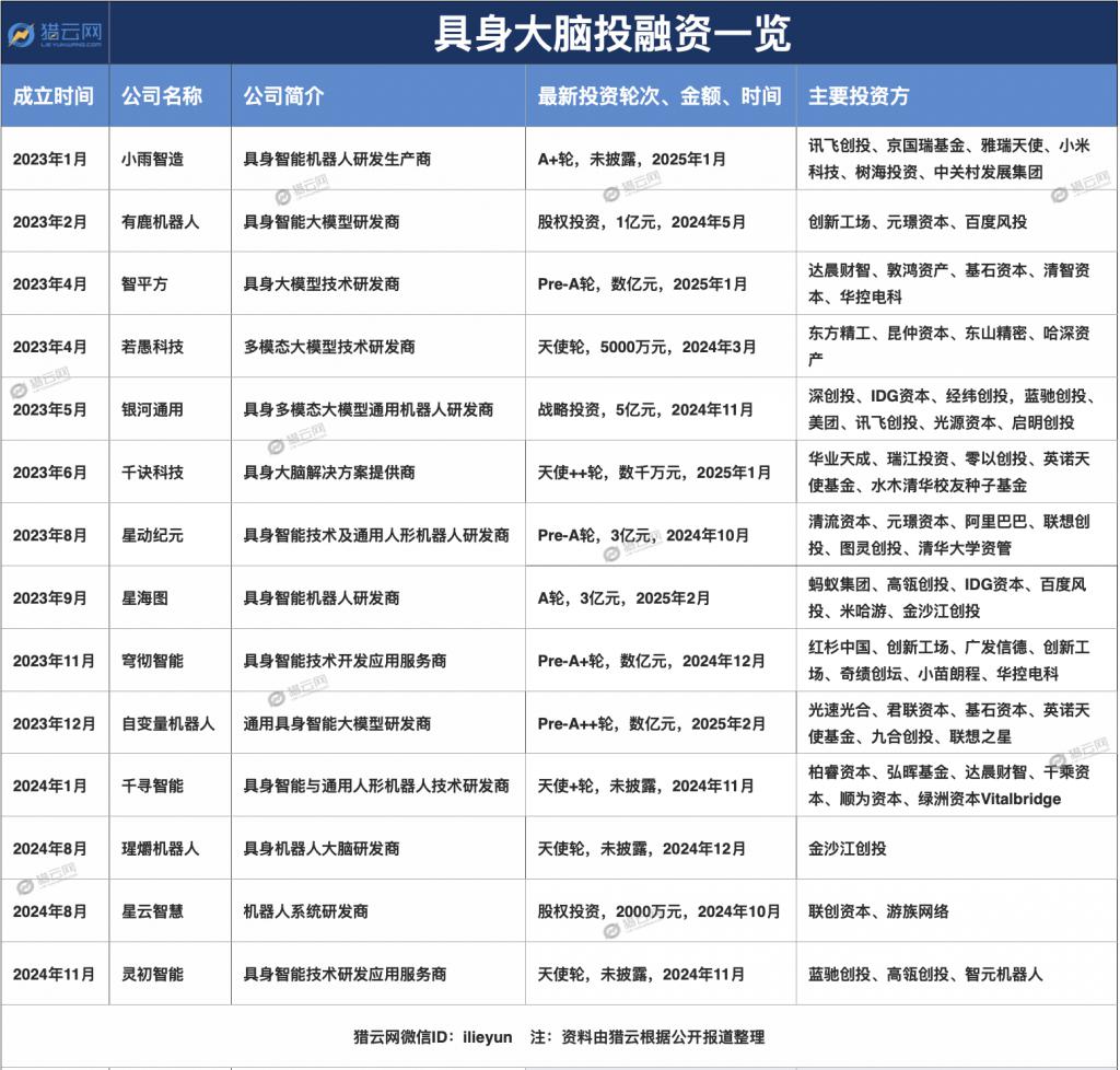 仅 2025 年开年以来," 具身大脑 " 这一细分领域,就前有小米投资的小雨智造再获讯飞 独家 A+ 轮投资,后有千诀科技连续完成数千万元天使 + 和天使 ++ 轮融资,近期又有自变量机器人完成光速光合、君联资本领投数亿元 Pre-A++ 轮融资……知名机构不断加码,投资金额屡创新高。