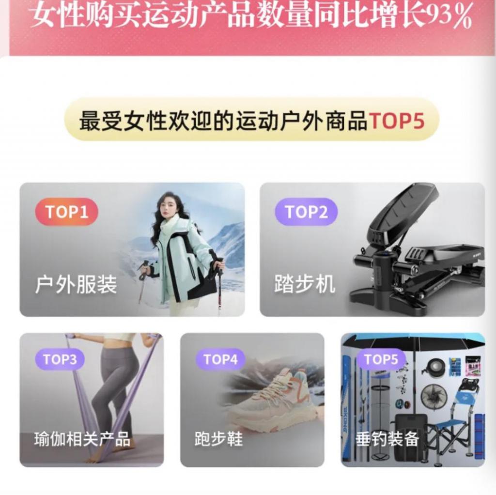 为户外运动 " 氪金 " 已经是女性消费的常态。《2024 抖音电商女性消费趋势数据报告》显示,对比同期,女性购买运动产品数量增长 93%,户外服装、踏步机、跑步鞋、垂钓装备等相关产品一直是热门品类。