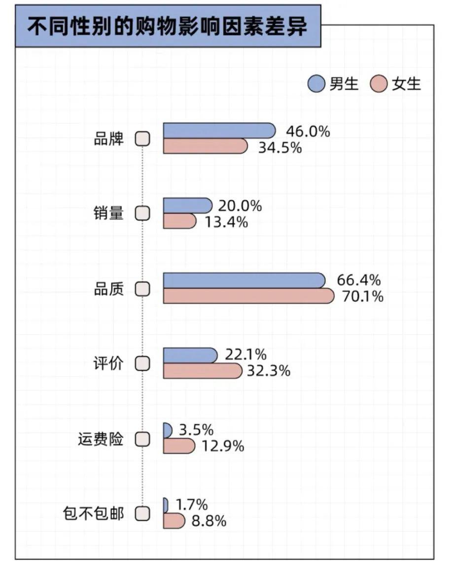 相较于男性,女性消费决策周期更长、偏好做足攻略,在理性比价和对比中选择更适合自己的产品。以线上购物为例,女性对品质、评价和运费险的关注度显著高于男性 [ 10 ] 。