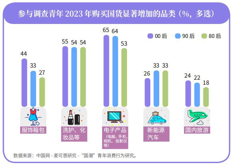 圈层链接外,文化自信也催生出女性群体的国潮消费热情,Z 世代女性买国货不只为性价比,更为一句 " 文化自信 "。"00 后 " 群体购买国货电子产品和洗护化妆品显著增加的比例分别为 65% 和 55%,均高于其他代际 [ 7 ] 。