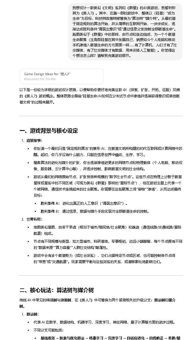 让 GPT-o1 根据 idea 设计游戏,几百字的描述可以迅速被扩展成数页的详细内容