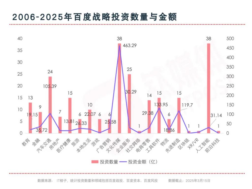 早年间,百度集团战投在文娱传媒等领域投入颇多,而随着战略重心的调整,逐步加大了对AI技术和相关应用领域的关注。根据IT桔子不完全统计,截至2025年3月15日,百度集团战投累计投资38家人工智能企业,与文娱传媒领域的投资项目数量相当。