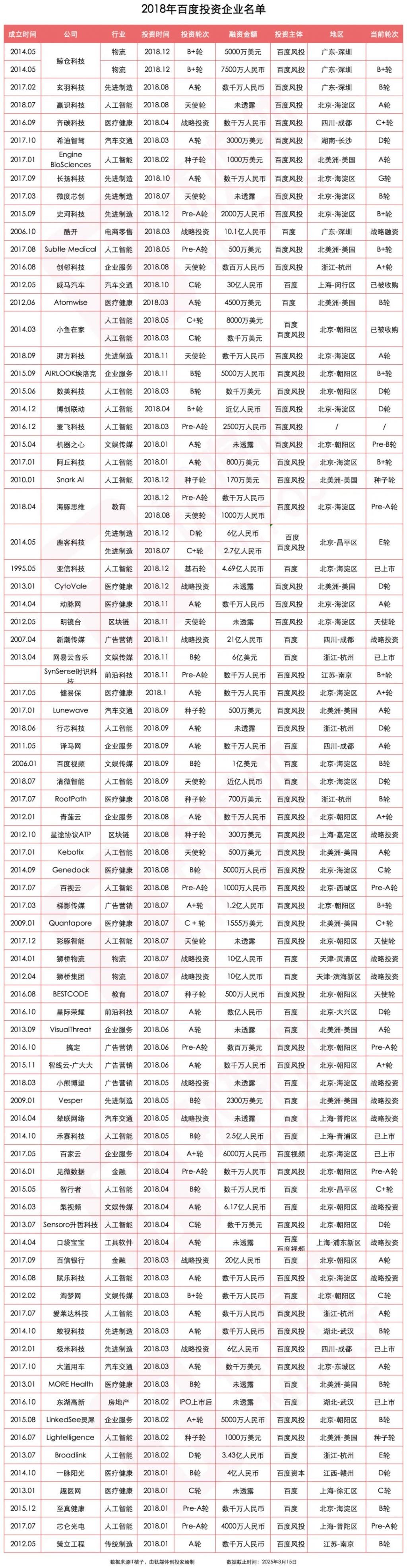 尤其值得一提的是2018年,百度(百度战投、百度资本、百度风投)在股权投资方面达到了一个高峰,全年共投资了86家公司,这或许能被解读为其试图通过资本手段加速AI战略布局的决心。