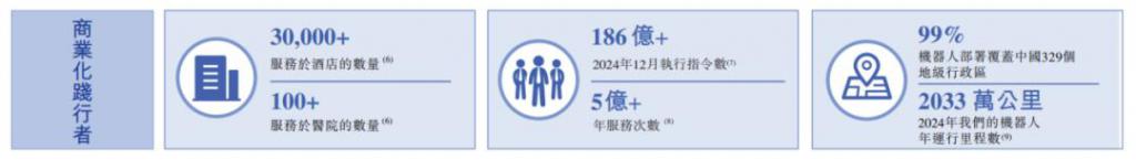 招股书显示:自成立以来,云迹科技已积累超过 3.4 万名企业客户,包括截至 2024 年底超过 30000 家酒店和 100 家医院。2024 年一整年,云迹的机器人完成超 5 亿次服务,并于 2024 年 12 月,单月执行超过 186 亿次指令。
