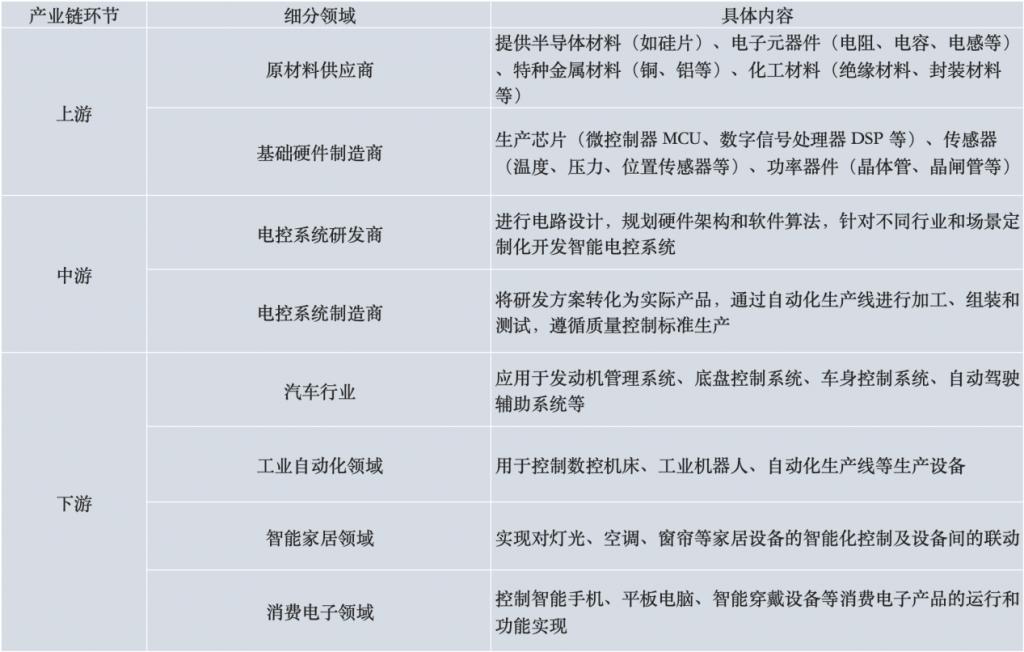 智能电控系统产业链可拆解为:上游为基础层,提供原材料和基础硬件;中游是技术核心层,负责电控系统的研发制造;下游是应用拓展层。