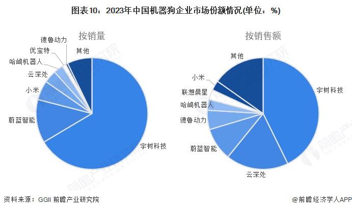 目前,中国机器狗行业龙头企业为宇树科技、蔚蓝智能和云深处科技。2023 年,按机器狗销量来看,宇树科技的市场份额最大,达 66.46%,其次为蔚蓝智能,市场份额为 12.59%; 按机器狗销售额来看,宇树科技的市场份额达 42.74%,云深处科技的市场份额为 18.09%,蔚蓝智能的市场份额为 9.53%。