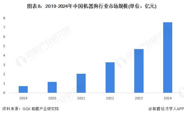 近年来,我国机器狗市场快速增长,娱乐、教育、巡检等领域需求成为主要推动力。据 GGII 数据,2023 年中国机器狗市场规模达 4.68 亿元,同比增长 42.7%,2019-2023 年 CAGR 高达 59.7%。结合历年统计数据及市场变动情况,初步统计,2024 年我国机器狗市场规模约 7.55 亿元。