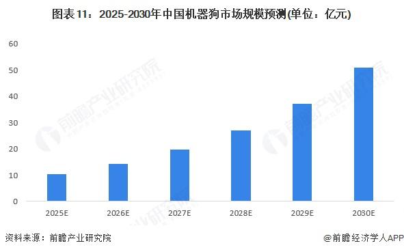 在国家产业政策的支持、技术条件逐渐成熟以及下游消费需求释放的推动下,中国机器狗市场规模预计在 2025 至 2030 年间持续上升,2030 年市场规模将突破 50 亿元,2025-2030 年的复合年增长率达到 37.5%。