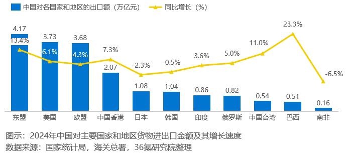 近十年我国出口贸易规模保持稳定增长。2024 年我国全年出口额达 25.45 万亿元人民币,同比增长 7.1%,展现出较强的动能和活力。新兴市场与 " 一带一路 " 沿线国家在我国出口中的地位逐步上升,成为新增长点。例如,对共建 " 一带一路 " 国家出口贸易整体增长 9.6%,对巴西增长 23.3%,对阿联酋增长 19.2%,对沙特增长 18.2%。