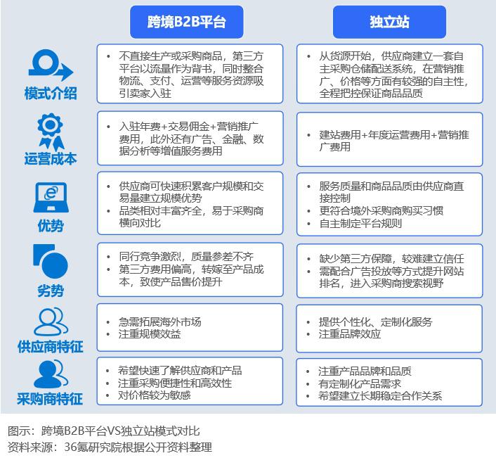 展会与地面推广因技术革新而取得小范围进步,行业规模稳步增长。B 端采购行为线上化趋势明显,跨境 B2B 贸易平台具有较高成长空间;全球电商去中心化趋势崛起,独立站模式快速发展。因而,在线上渠道中,跨境 B2B 平台与独立站模式各有千秋,并举发展。
