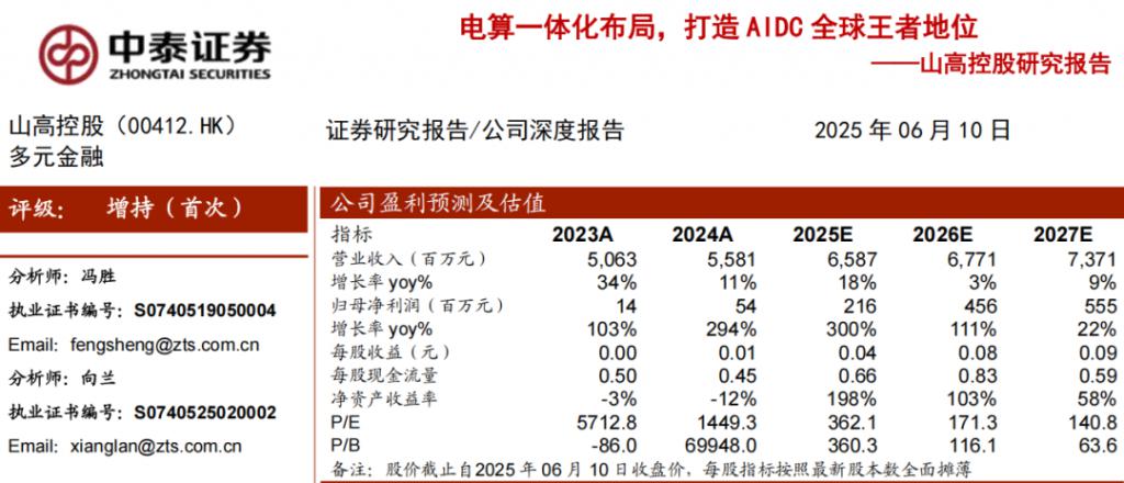 中泰证券更是大胆预测,完成电算一体化布局的山高控股,将从 " 中国电算龙头 " 成长为 " 全球电算王者 "。研报预计,2025-2027 年,山高控股营业收入分别约为 65.87 亿、67.71 亿和 73.71 亿元,归母净利润分别约为 2.16 亿、4.56 亿和 5.55 亿元。