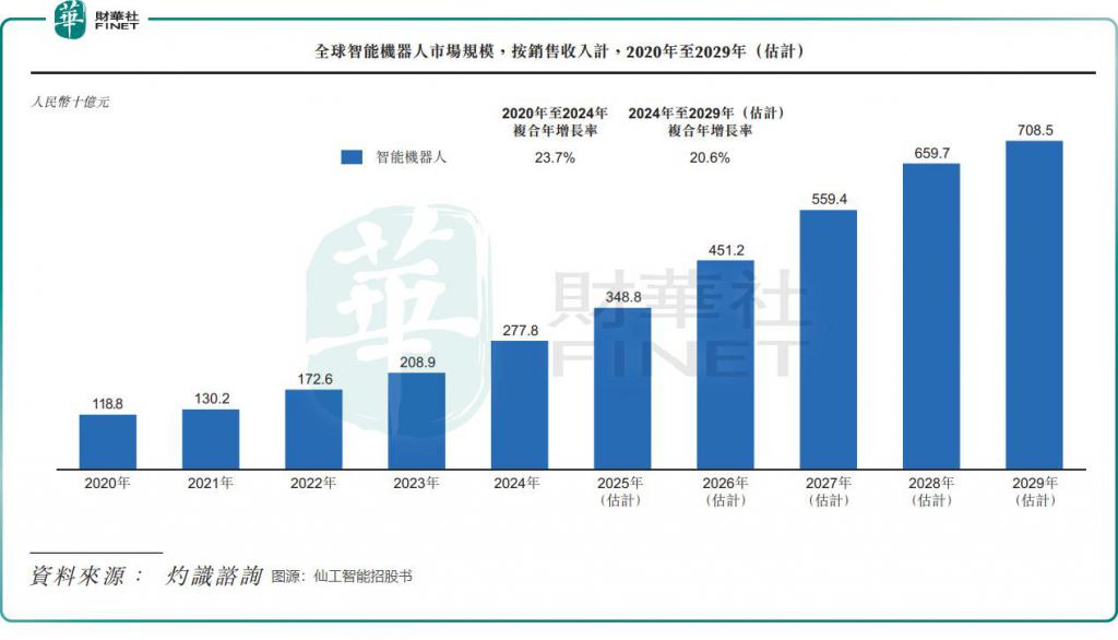 根据仙工智能招股书,全球智能机器人产业已进入快速发展阶段,预计到 2029 年的市场规模将达到 7085 亿元 ( 单位人民币,下同 ) ,2024 年至 2029 年期间的复合年增长率为 20.6%。