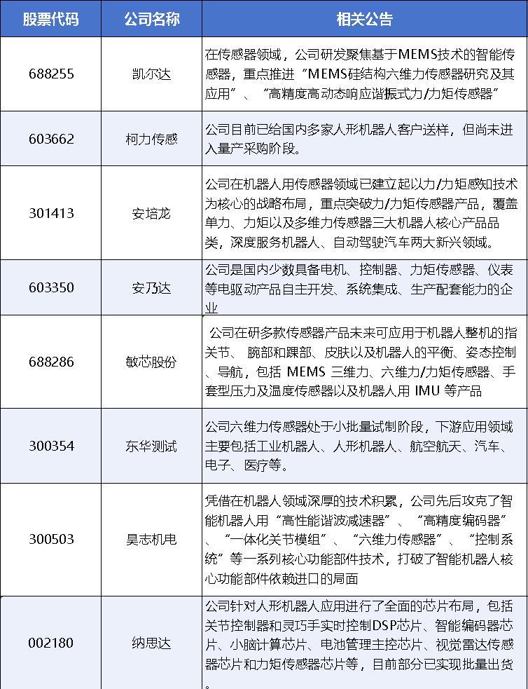 目前,国内有约 8 家上市公司公告布局于机器人相关的力 / 力矩传感器业务,大多处于研发和试制阶段。其中,柯力传感用于 AI 理疗机器人机械臂上的六维力传感器在 2025 年上半年已实现了数百台的批量出货,但用于人形机器人的产品仍然处于客户送样阶段;东华测试六维力传感器处于小批量试制阶段。