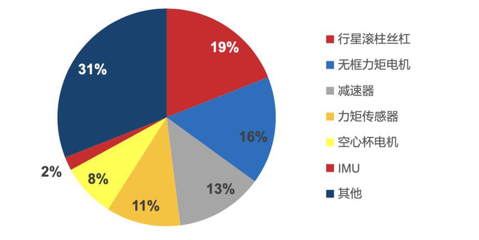 按核心零部件拆分价值量,根据东海证券,预计到 2030 年,人形机器人的核心零部件价值量占比分别为行星滚柱丝杠(19%)、无框力矩电机(16%)、减速器(13%)、力矩传感器(11%)、空心杯电机(8%)、惯性测量单元(2%)。此外,电池、芯片、雷达、驱动器、编码器等零部件统一归类到其他,合计价值量占比为 31%。