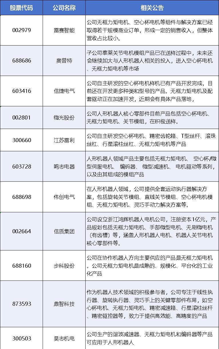 目前,国内已经至少有 10 家上市公司公告了其在无框力矩电机的布局,主要处于送样 / 已商业化阶段。