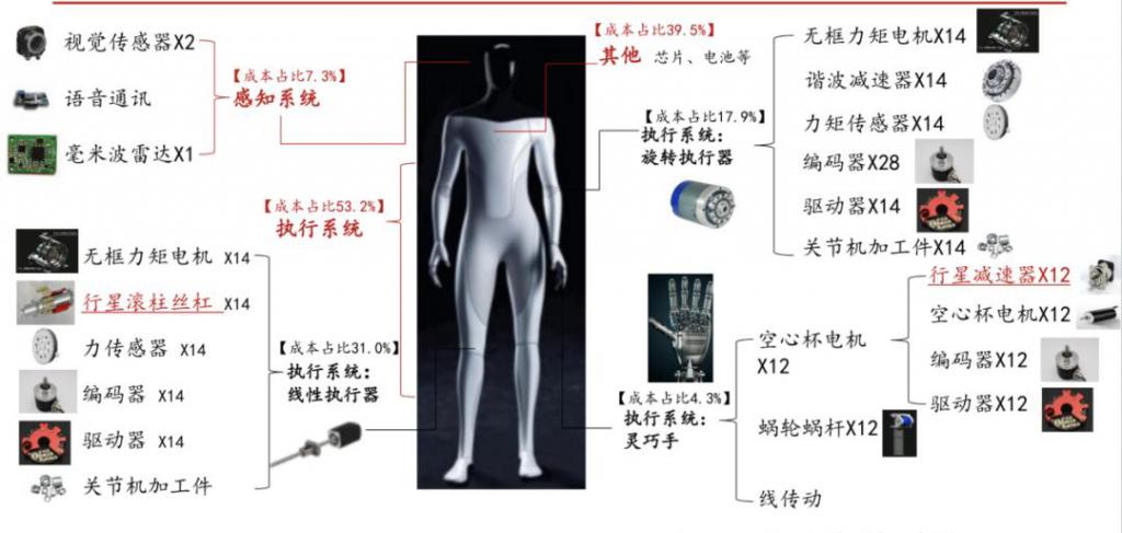 按照功能模块拆分价值量,根据光大证券统计,以远期 20 万单价测算,执行系统 BOM(剔除电池、骨架)占比 53.2%,感知系统占 7.3%,其他芯片、电池等部件合计占比 39.5%。将执行系统价值量进一步拆分,直线关节、旋转关节、灵巧手分别占 31.0%、17.9%、4.3%。
