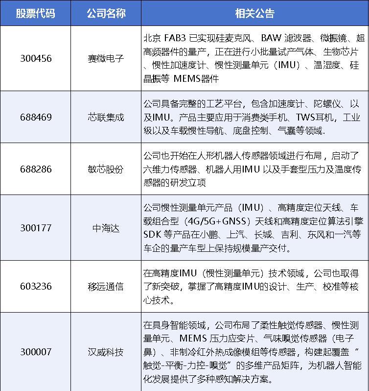 目前,A 股公开拥有 IMU 产品的上市公司至少在 6 家以上。具体来看,中海达 IMU 产品已经在新能源 领域开启量产交付;赛微电子正在小批量试产阶段;敏芯股份则启动了六维力传感器、机器人用 IMU 以及手套型压力及温度传感器的研发立项。