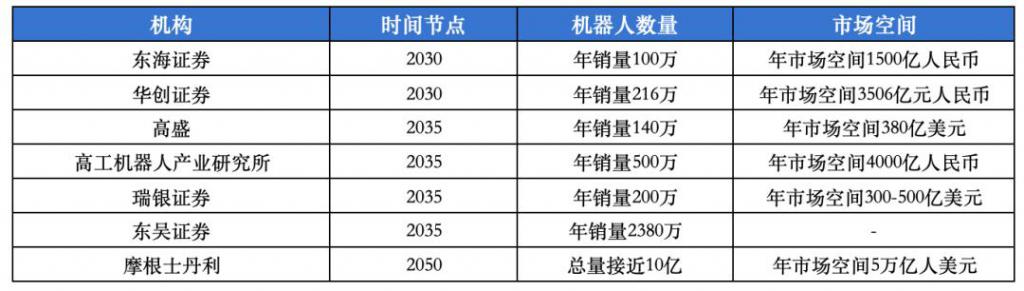 在 2035 年这一节点,高盛认为全球人形机器人销量约 140 万台,对应市场空间 380 亿美元,瑞银证券认为全球人形机器人销量约 200 万台,对应市场空间 300-500 亿美元,与高盛预测接近,但东吴证券则给出年销量 2380 万台的预测。