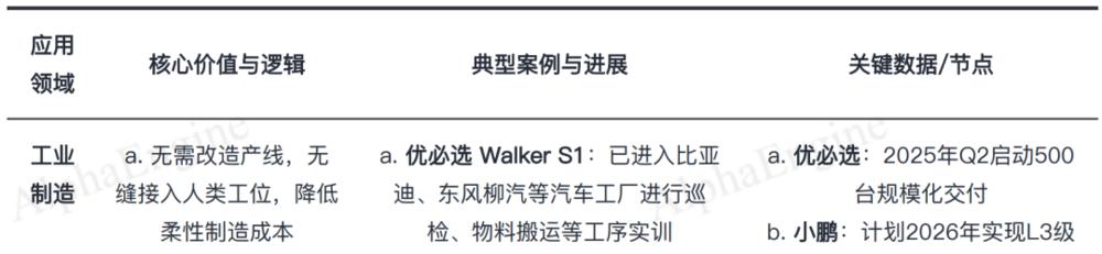 当前,工业制造是核心突破口,聚焦 产线等柔性生产环节;商业服务正加速拓展,在无人零售、办公服务等场景验证价值;家庭服务作为远期目标,因技术复杂度和成本较高,商业化尚处早期探索阶段。