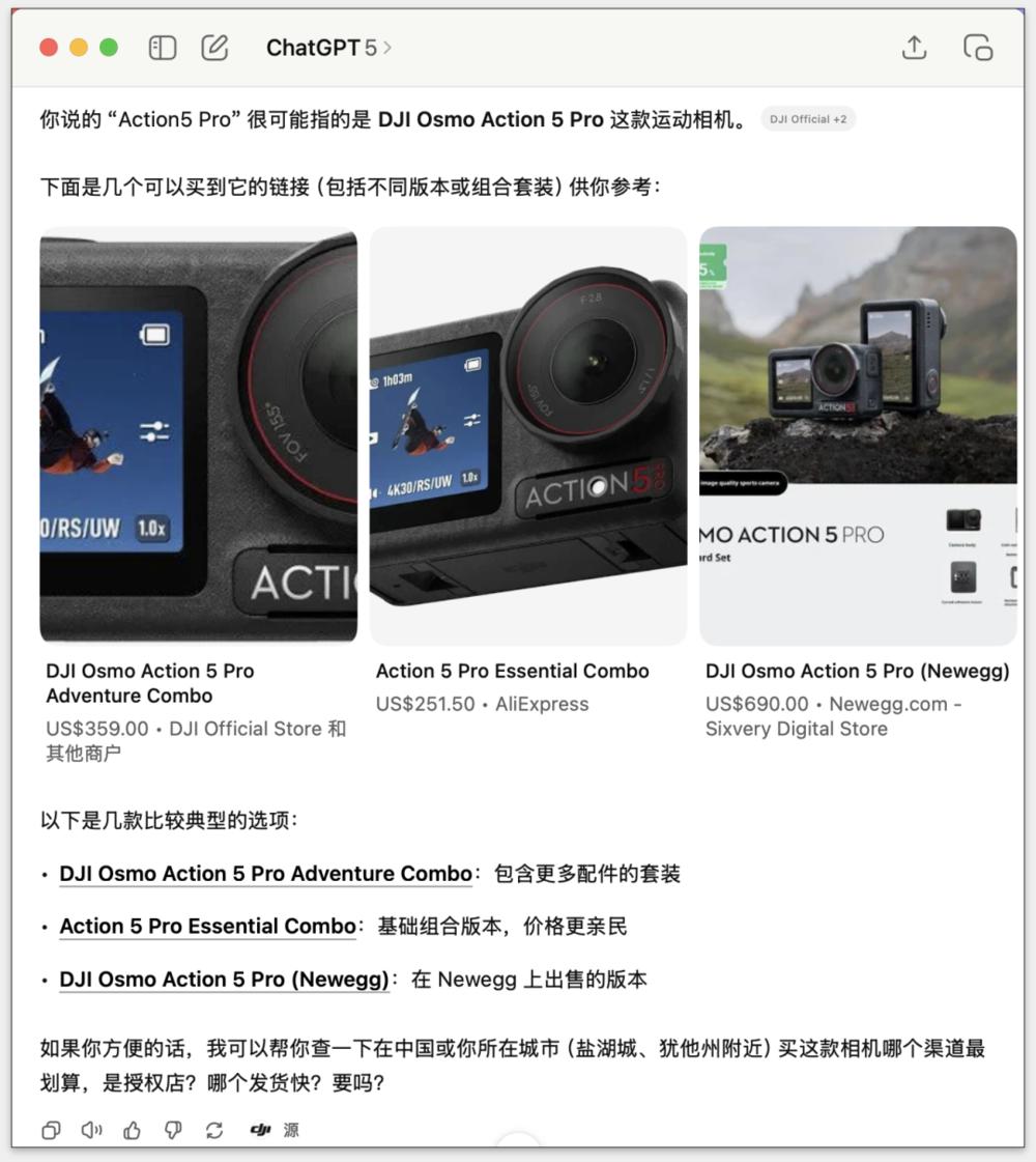 把需求在 chat GPT 里直接丢给它,说:" 帮我找一台 Action 5 Pro。" 反馈挺快:几个电商页面的链接,价格区间写得清楚,还贴心地标出来哪个是 " 套装版 "、" 单机身 "。