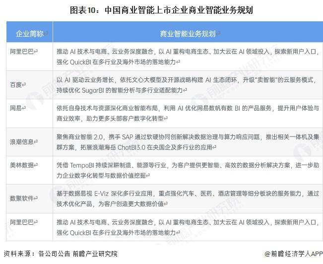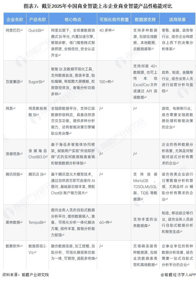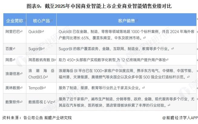 阿里巴巴 QuickBI、百度 SugarBI、网易数帆有数 BI、浪潮信息浪潮海岳 ChatBI3.0、美林数据 TempoBI、数聚软件数据易视 E-Viz,核心产品分别覆盖金融、政务、头部企业、央国企、龙头企业及多行业客户,且在海外市场、 医药等细分领域各有突破。