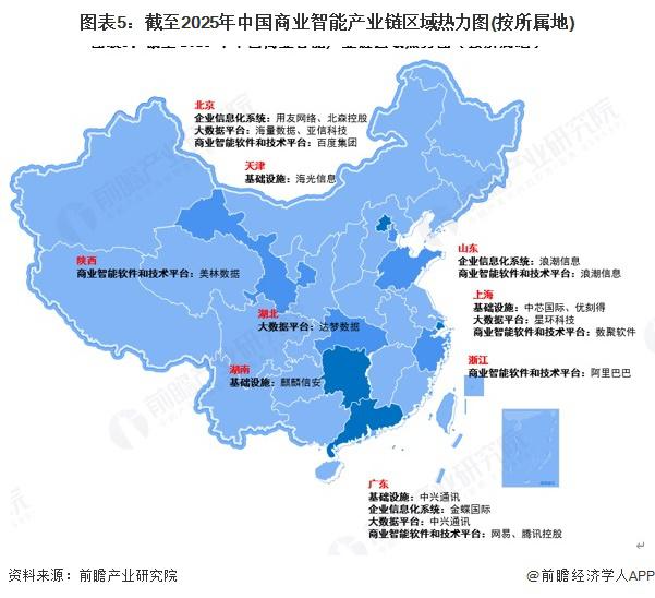 中国商业智能产业链区域分布呈东部密集、中西部跟进态势,北京、广东、上海覆盖多环节且产业优势突出,湘、鲁、陕等省市则在特定产业链环节发力。